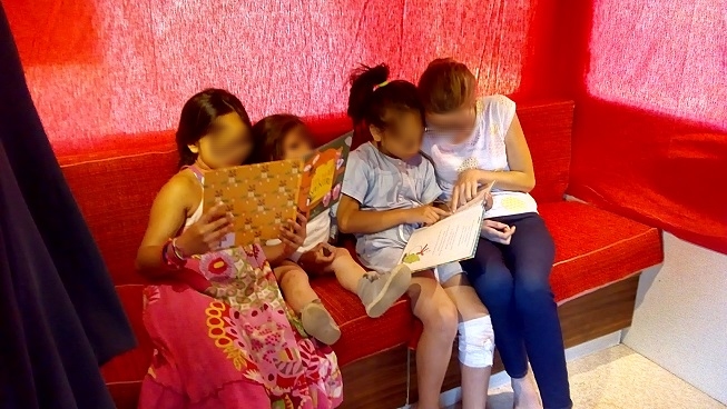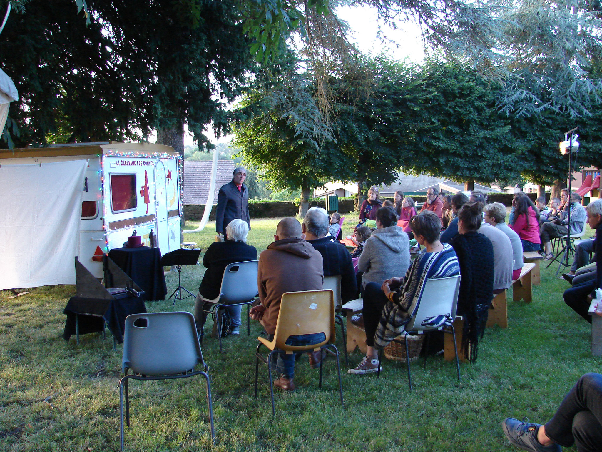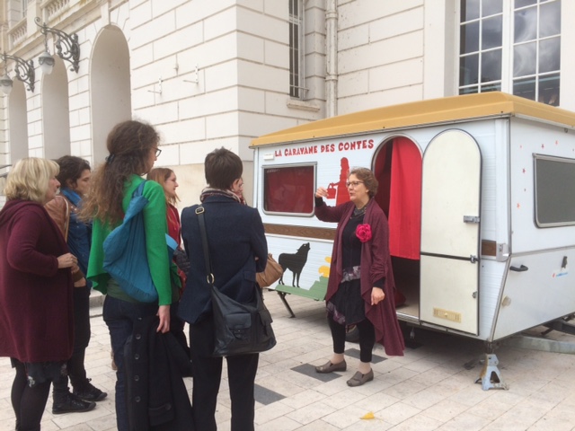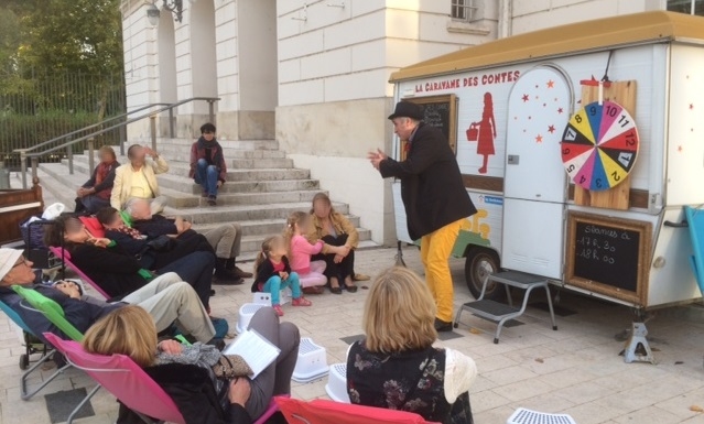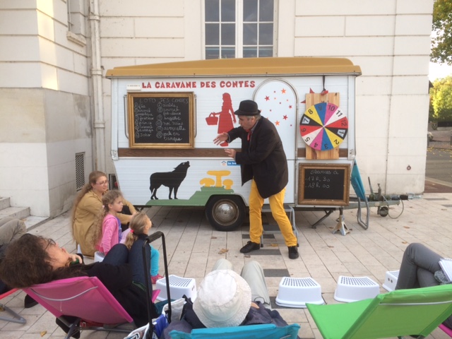 LE MINIBUS A HISTOIRES est aménagée= comme une mini-salle de spectacles. A l’intérieur, je conte, je joue de la kalimba, on discute avec ses voisins même si on ne les connaît pas … Parfois, on y découvre des mini-formes de théâtre d’ombres ou d'autres bonne surprises